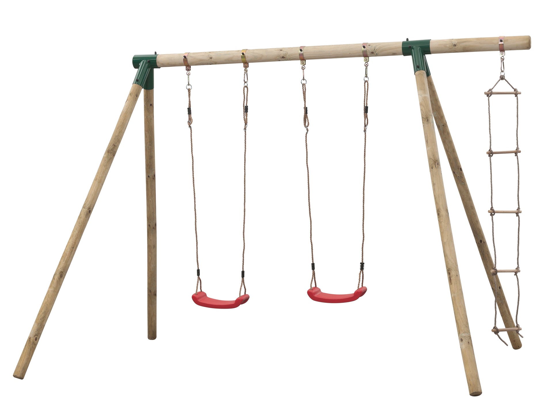 Die Doppelschaukel ist aus Rundholz gefertigt und ist glatt gehobelt. Die Verbindungsstücke aus Metall vereinfachen den Aufbau, da die Stahleckverbindungen für den korrekten Winkel aller Teile sorgen.